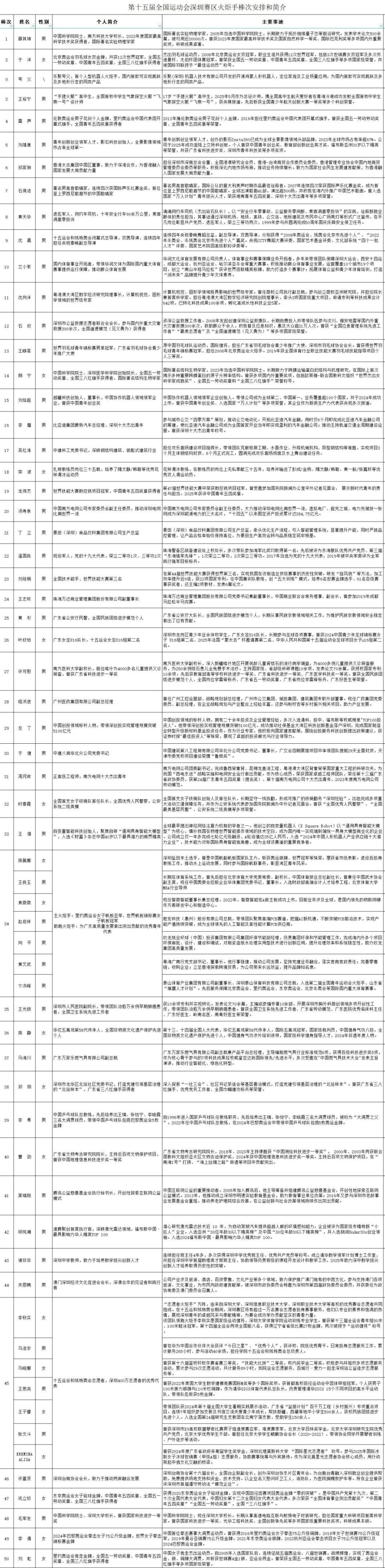 除了上述五位代表人物外,本次十五运会深圳火炬手名单还包括了来自各个领域的众多杰出人士。这份名单展现了深圳作为创新之都的多元化和包容性。